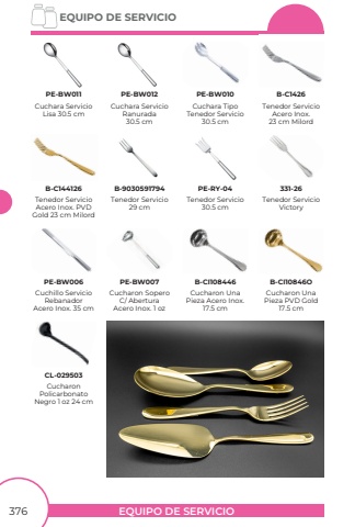 EQUIPO DE SERVICIOEQUIPO DE SERVICIO376Cuchara ServicioRanurada30.5 cmCuchara Servicio Lisa 30.5 cmPE-BW011PE-BW012Tenedor Servicio30.5 cmTenedor ServicioVictoryCuchillo ServicioRebanadorAcero Inox. 35 cmTenedor ServicioAcero Inox. PVD Gold 23 cm MilordTenedor Servicio29 cmTenedor ServicioAcero Inox.23 cm MilordCuchara TipoTenedor Servicio30.5 cmCucharon Sopero C/ AberturaAcero Inox. 1 ozCucharon Una Pieza Acero Inox.17.5 cmCucharon UnaPieza PVD Gold17.5 cmCucharonPolicarbonatoNegro 1 oz 24 cmPE-RY-04331-26PE-BW006B-C144126B-9030591794PE-BW010B-C1426PE-BW007B-CI108446B-CI10846OCL-029503