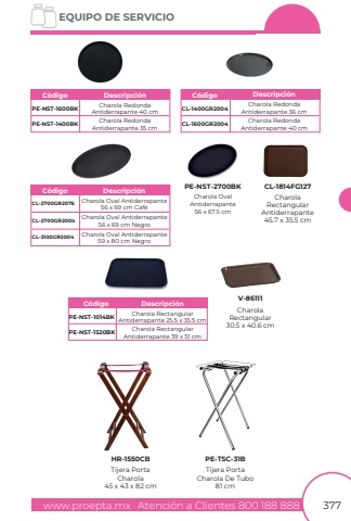 www.proepta.mxAtenci%u00f3n a Clientes 800 188 888EQUIPO DE SERVICIO377CharolaRectangularAntiderrapante45.7 x 35.5 cmCharolaRectangular30.5 x 40.6 cmCharola OvalAntiderrapante56 x 67.5 cmCL-1814FG127V-86111PE-NST-2700BKCL-2700GR2004CL-3100GR2004Charola Oval Antiderrapante56 x 69 cm NegroCharola Oval Antiderrapante59 x 80 cm NegroC%u00f3digoDescripci%u00f3nCL-1400GR2004PE-NST-1014BKPE-NST-1600BKCL-1600GR2004PE-NST-1520BKPE-NST-1400BKCharola RedondaAntiderrapante 36 cmCharola RectangularAntiderrapante 25.5 x 35.5 cmCharola RedondaAntiderrapante 40 cmCharola RedondaAntiderrapante 40 cmCharola RectangularAntiderrapante 39 x 51 cmCharola RedondaAntiderrapante 35 cmC%u00f3digoC%u00f3digoC%u00f3digoDescripci%u00f3nDescripci%u00f3nDescripci%u00f3nCL-2700GR2076Charola Oval Antiderrapante56 x 69 cm Caf%u00e9Tijera PortaCharola45 x 43 x 82 cmTijera PortaCharola De Tubo 81 cmHR-1550CBPE-TSC-31B