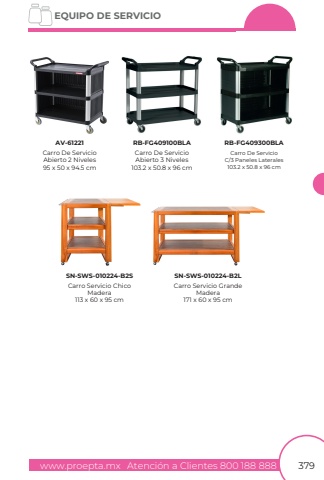 www.proepta.mxAtenci%u00f3n a Clientes 800 188 888EQUIPO DE SERVICIO379Carro De ServicioAbierto 3 Niveles103.2 x 50.8 x 96 cmCarro De ServicioAbierto 2 Niveles95 x 50 x 94.5 cmCarro Servicio Chico Madera113 x 60 x 95 cmCarro Servicio Grande Madera171 x 60 x 95 cmCarro De ServicioC/3 Paneles Laterales103.2 x 50.8 x 96 cmAV-61221RB-FG409100BLASN-SWS-010224-B2SSN-SWS-010224-B2LRB-FG409300BLA
