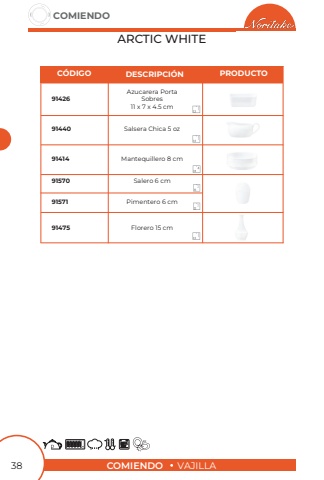 COMIENDOVAJILLACOMIENDO38ARCTIC WHITE Pimentero 6 cmSalero 6 cmAzucarera Porta Sobres11 x 7 x 4.5 cmSalsera Chica 5 ozMantequillero 8 cmFlorero 15 cm915719157091426914409141491475C%u00d3DIGODESCRIPCI%u00d3NPRODUCTO
