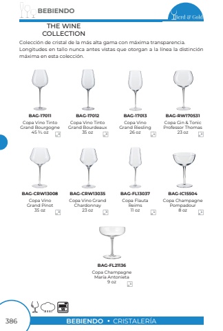 BEBIENDO386BEBIENDOCRISTALER%u00cdACopa Vino TintoGrand Bourgogne45 3/4 ozCopa Gin & TonicProfessor Thomas23 ozCopa FlautaReims11 ozCopa ChampagneMar%u00eda Antonieta9 ozCopa VinoGrand Riesling26 ozCopa Vino GrandChardonnay23 ozCopa Vino TintoGrand Bourdeaux35 ozCopa VinoGrand Pinot35 ozCopa ChampagnePompadour8 ozBAG-17011BAG-RW170531BAG-FL13037BAG-FL21136BAG-17013BAG-CRW13035BAG-17012BAG-CRW13008BAG-IC15504444466664Colecci%u00f3n de cristal de la m%u00e1s alta gama con m%u00e1xima transparencia.Longitudes en tallo nunca antes vistas que otorgan a la l%u00ednea la distinci%u00f3n m%u00e1xima en esta colecci%u00f3n.THE WINECOLLECTION