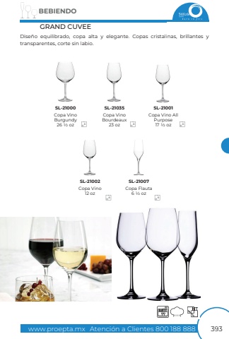 www.proepta.mxAtenci%u00f3n a Clientes 800 188 888BEBIENDO393Dise%u00f1o equilibrado, copa alta y elegante. Copas cristalinas, brillantes ytransparentes, corte sin labio.GRAND CUVEECopa VinoBurgundy26 1/2 ozCopa Vino12 ozCopa VinoBourdeaux23 ozCopa Flauta6 1/2 ozCopa Vino All Purpose17 1/2 ozSL-21000SL-21002SL-21035SL-21007SL-2100166666