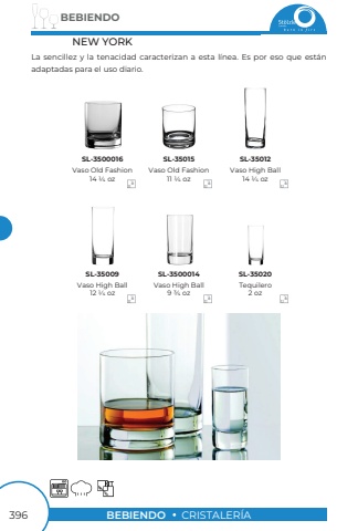 BEBIENDO396BEBIENDOCRISTALER%u00cdALa sencillez y la tenacidad caracterizan a esta l%u00ednea. Es por eso que est%u00e1n adaptadas para el uso diario.NEW YORKVaso High Ball14 1/4 ozVaso High Ball12 1/4 ozVaso Old Fashion11 1/4 ozVaso High Ball9 3/4 ozVaso Old Fashion14 1/4 ozTequilero2 ozSL-35012SL-35009SL-35015SL-3500014SL-3500016SL-35020666666