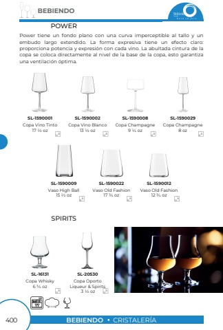 BEBIENDO400BEBIENDOCRISTALER%u00cdAPower tiene un fondo plano con una curva imperceptible al tallo y unembudo largo extendido. La forma expresiva tiene un efecto claro:proporciona potencia y expresi%u00f3n con cada vino. La abultada cintura de la copa se coloca directamente al nivel de la base de la copa, esto garantiza una ventilaci%u00f3n %u00f3ptima.POWERSPIRITSCopa Vino Blanco13 1/2 ozCopa Champagne9 1/4 ozCopa Champagne8 ozCopa Vino Tinto17 1/2 ozVaso Old Fashion17 3/4 ozVaso High Ball15 1/2 ozCopa Whisky6 3/4 ozVaso Old Fashion12 3/4 ozCopa OportoLiqueur & Spirits 3 1/2 ozSL-1590001SL-1590002SL-1590008SL-1590029SL-1590009SL-1590022SL-16131SL-1590012SL-20530666666666