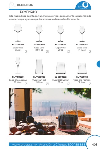 www.proepta.mxAtenci%u00f3n a Clientes 800 188 888BEBIENDO403Esta nueva l%u00ednea cuenta con un motivo vertical que aumenta la superficie de la copa, lo que ayuda a que los aromas se desarrollen libremente.Copa Vino25 ozCopa Champagne10 1/4 ozCopa Vino20 ozVaso High Ball15 1/2 ozCopa Vino14 1/4 ozVaso Old Fashion17 ozCopa Vino22 3/4 ozVaso Old Fashion12 3/4 ozSL-7310000SL-7310029SL-7310001SL-7590009SL-7310003SL-7590022SL-7310035SL-759001266666666SYMPHONY