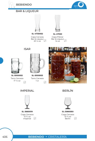 BEBIENDO406BEBIENDOCRISTALER%u00cdAISARIMPERIALBERL%u00cdNTarro Cerveza17 1/2 ozTarro Cerveza1 LtSL-5000052SL-500005366Copa CervezaBar & Liqueur23 1/2 ozSL-47300526BAR & LIQUEURCopa PilsnerBar & Liqueur14 ozSL-473506Copa Cerveza12 3/4 ozImperialSL-36600196Copa Cerveza13 1/2 ozBerlinSL-30800506
