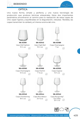 www.proepta.mxAtenci%u00f3n a Clientes 800 188 888BEBIENDO409OPTICAUna nueva forma, simple y perfecta, y una nueva tecnolog%u00eda deproducci%u00f3n que produce t%u00e9cnicas artesanales. Estos dos importantespar%u00e1metros encontraron el camino para la realizaci%u00f3n de estas copas de vino: s%u00faper ligeras y equilibradas en la degustaci%u00f3n, robustas flexibles, las copas transmiten la calidad y el intenso aroma del vino.Vaso Old Fashion15 1/4 ozCopa Champagne10 1/8 ozCopa Chardonnay18 1/2 ozVaso High Ball19 1/4 ozCopa Martini7 3/8 ozCopa Bourdeaux24 5/8 ozCopa Champagne7 ozCopa Cognac15 3/4 ozCopa Burgundy/Gin Glass25 1/4 oz98-A1319198-A1319098-A1314598-A1314398-A1316898-A1314498-A1318998-A1319298-A13142666666666