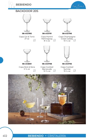 BEBIENDO412BEBIENDOCRISTALER%u00cdABACKDOOR 20SCopa MartiniHemingway8 1/2 ozCopa CocktailBarracuda10 3/4 ozCopa ChampagneGreat Gatsby10 1/4 ozCopa CocktailSunrise15 1/4 ozCopa Gin & Tonic27 ozCopa Nick & Nora5 3/4 oz98-A1379198-A1379898-A1379698-A1379598-A1378598-A13801666666
