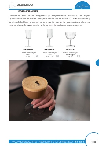 www.proepta.mxAtenci%u00f3n a Clientes 800 188 888BEBIENDO415Copa Mixolog%u00edaMist5 ozCopa Mixolog%u00edaGlow8 1/2 ozCopa Mixolog%u00edaMidnight9 oz98-A1319398-A1317698-A13161666SPEAKEASIESDise%u00f1adas con l%u00edneas elegantes y proporciones precisas, las copasSpeakeasies son el aliado ideal para realzar cada c%u00f3ctel. Su estilo refinado y funcionalidad las convierten en una opci%u00f3n perfecta para profesionales que buscan elevar la experiencia de la mixolog%u00eda en bares y restaurantes.