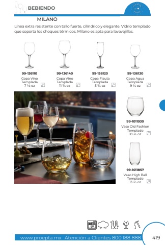 www.proepta.mxAtenci%u00f3n a Clientes 800 188 888BEBIENDO419MILANOL%u00ednea extra resistente con tallo fuerte, cil%u00edndrico y elegante. Vidrio templado que soporta los choques t%u00e9rmicos, Milano es apta para lavavajillas.Copa AguaTemplada9 1/4 ozCopa FlautaTemplada5 3/4 ozVaso Old FashionTemplado10 1/4 ozCopa VinoTemplada11 3/4 ozCopa VinoTemplada7 1/2 ozVaso High BallTemplado13 1/2 oz99-13612099-13613099-101193099-13611099-13614099-1011857121212121212