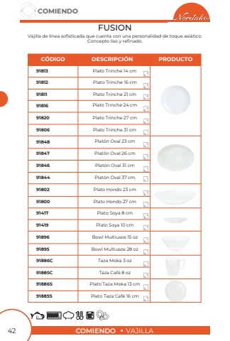 COMIENDOVAJILLACOMIENDO42FUSION Plato Trinche 16 cmPlato Trinche 24 cmPlat%u00f3n Oval 26 cmPlato Trinche 27 cmPlat%u00f3n Oval 31 cmPlato Hondo 23 cmPlato Soya 8 cmBowl Multiusos 15 ozTaza Moka 3 ozPlato Taza Moka 13 cmPlato Trinche 31 cmPlat%u00f3n Oval 37 cmPlato Hondo 27 cmPlato Soya 10 cmBowl Multiusos 28 ozTaza Caf%u00e9 8 ozPlato Taza Caf%u00e9 16 cmPlato Trinche 14 cmPlato Trinche 21 cmPlat%u00f3n Oval 23 cm918129181691847918209184691802914179189691886C91886S918069184491800914199189591885C91885S918139181191848C%u00d3DIGODESCRIPCI%u00d3NPRODUCTOVajilla de l%u00ednea sofisticada que cuenta con una personalidad de toque asi%u00e1tico.Concepto liso y refinado.