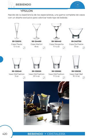 BEBIENDO420BEBIENDOCRISTALER%u00cdAYPSILONCopa Flauta5 1/2 ozCopa Martini8 ozCopa Margarita11 1/4 oz99-12501099-12449099-166440666Nacido de la experiencia de los especialistas, una gama completa de vasos con un dise%u00f1o exclusivo para valorizar todo tipo de bebida.Copa De Postre13 oz99-34075012Vaso Old Fashion11 1/2 ozVaso Old Fashion5 ozVaso Old Fashion8 1/2 oz99-12504099-12502099-1250606612Vaso High Ball10 1/2 oz99-12503012