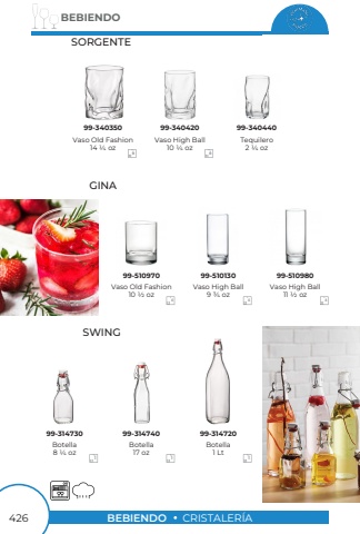 BEBIENDO426BEBIENDOCRISTALER%u00cdASORGENTEVaso Old Fashion14 1/4 ozTequilero2 1/4 ozVaso High Ball10 1/4 oz99-34035099-34042099-34044066GINAVaso High Ball9 3/4 ozVaso Old Fashion10 1/2 ozVaso High Ball11 1/2 oz99-51097099-51013099-510980 6 6 6SWINGBotella1 LtBotella17 ozBotella8 1/4 oz99-31473099-31474099-314720111