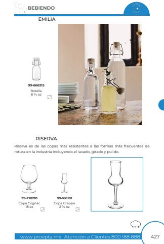 www.proepta.mxAtenci%u00f3n a Clientes 800 188 888BEBIENDO427Botella8 2/5 oz99-666215 1EMILIARiserva es de las copas m%u00e1s resistentes a las formas m%u00e1s frecuentes derotura en la industria incluyendo el lavado, girado y pulido.RISERVACopa Cognac18 ozCopa Grappa2 3/4 oz99-13021099-16618166