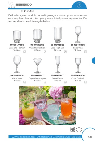 www.proepta.mxAtenci%u00f3n a Clientes 800 188 888BEBIENDO431Delicadeza y romanticismo, estilo y elegancia atemporal se unen en esta amplia colecci%u00f3n de copas y vasos. Ideal para una presentaci%u00f3n sorprendente de c%u00f3cteles y bebidas.FLORIANVaso Old Fashion10 1/8 ozCopa Vino18 1/8 ozVaso Old Fashion12 5/8 ozCopa Champagne8 1/8 ozVaso High Ball14 1/2 ozCopa Flauta7 1/8 ozCopa Vino12 7/8 ozCopa Cocktail8 1/4 oz99-199417BCG99-199411BCG99-199416BCG99-199412BCL99-199415BCG99-199413BCG99-199410BCG99-199414BCG66666666