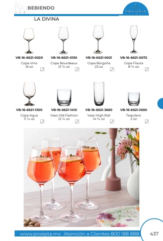 www.proepta.mxAtenci%u00f3n a Clientes 800 188 888BEBIENDO437LA DIVINACopa Borgo%u00f1a23 ozVaso High Ball14 3/4 ozCopa Flauta8 3/4 ozTequilero2 ozCopa Bourdeaux21 3/4 ozVaso Old Fashion12 1/4 ozCopa Vino16 ozCopa Agua11 1/4 ozVB-16-6621-0021VB-16-6621-3660VB-16-6621-0072VB-16-6621-3650VB-16-6621-0130VB-16-6621-1410VB-16-6621-0020VB-16-6621-130044444444
