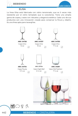 BEBIENDO442BEBIENDOCRISTALER%u00cdACopa Vino14 ozCopa Vino10 ozVaso High Ball6 1/4 ozCopa Vino7 3/4 ozVaso Old Fashion7 3/4 ozCopa Flauta5 3/4 ozARC-J4726ARC-J4727ARC-27754ARC-J4730ARC-J4734ARC-J4591666666La l%u00ednea Elisa est%u00e1 fabricada con vidrio tensionado, que es 5 veces m%u00e1sresistente por el vidrio templado que la caracteriza. Tiene una amplia gama de copas y vasos con robustez y elegancia est%u00e9tica. Cada uno de susproductos son una innovaci%u00f3n creada para conservar la finura y dise%u00f1o.Es una l%u00ednea apta para lavavajillas.ELISA