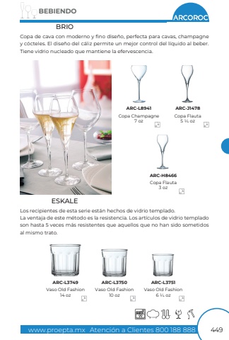 www.proepta.mxAtenci%u00f3n a Clientes 800 188 888BEBIENDO449Copa Champagne7 ozVaso Old Fashion14 oz66666BRIOESKALECopa de cava con moderno y fino dise%u00f1o, perfecta para cavas, champagne y c%u00f3cteles. El dise%u00f1o del c%u00e1liz permite un mejor control del l%u00edquido al beber. Tiene vidrio nucleado que mantiene la efervescencia.Los recipientes de esta serie est%u00e1n hechos de vidrio templado.La ventaja de este m%u00e9todo es la resistencia. Los art%u00edculos de vidrio templado son hasta 5 veces m%u00e1s resistentes que aquellos que no han sido sometidos al mismo trato.Copa Flauta5 1/4 ozVaso Old Fashion10 ozCopa Flauta3 ozVaso Old Fashion6 1/4 ozARC-L8941ARC-L3749ARC-J1478ARC-L3750ARC-H8466ARC-L37516