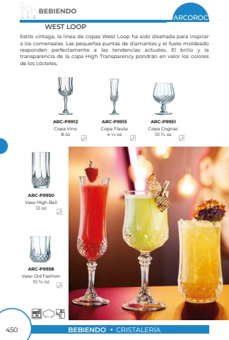 BEBIENDO450BEBIENDOCRISTALER%u00cdAEstilo vintage, la l%u00ednea de copas West Loop ha sido dise%u00f1ada para inspirar a los comensales. Las peque%u00f1as puntas de diamantes y el fuste moldeadoresponden perfectamente a las tendencias actuales. El brillo y latransparencia de la copa High Transparency pondr%u00e1n en valor los coloresde los c%u00f3cteles.WEST LOOPVaso High Ball12 ozCopa Cognac10 3/4 ozVaso Old Fashion10 3/4 ozCopa Flauta4 1/2 ozCopa Vino8 ozARC-P9950ARC-P9951ARC-P9958ARC-P9912ARC-P991366666