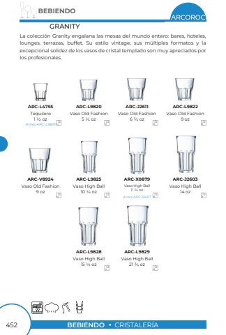 BEBIENDO452BEBIENDOCRISTALER%u00cdATequilero1 1/2 ozAntes ARC-L9819Antes ARC-J2607La colecci%u00f3n Granity engalana las mesas del mundo entero: bares, hoteles,lounges, terrazas, buffet. Su estilo vintage, sus m%u00faltiples formatos y laexcepcional solidez de los vasos de cristal templado son muy apreciados por los profesionales.GRANITYVaso High Ball10 1/4 ozVaso High Ball21 3/4 ozVaso Old Fashion5 1/4 ozVaso High Ball11 3/4 ozVaso Old Fashion6 3/4 ozVaso Old Fashion9 ozVaso High Ball14 ozVaso High Ball15 1/2 ozVaso Old Fashion9 ozARC-L4755ARC-L9825ARC-L9829ARC-L9820ARC-X0879ARC-J2611ARC-L9822ARC-J2603ARC-L9828ARC-V892412121212121212121212