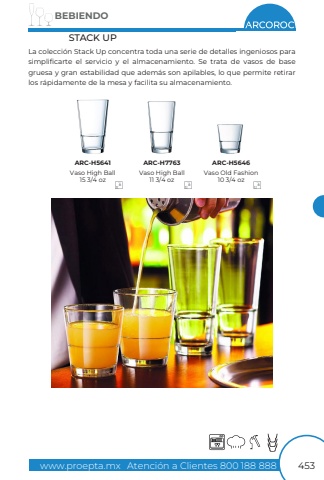 www.proepta.mxAtenci%u00f3n a Clientes 800 188 888BEBIENDO453STACK UPLa colecci%u00f3n Stack Up concentra toda una serie de detalles ingeniosos para simplificarte el servicio y el almacenamiento. Se trata de vasos de basegruesa y gran estabilidad que adem%u00e1s son apilables, lo que permite retirarlos r%u00e1pidamente de la mesa y facilita su almacenamiento.Vaso High Ball15 3/4 oz666Vaso High Ball11 3/4 ozVaso Old Fashion10 3/4 ozARC-H5641ARC-H7763ARC-H5646