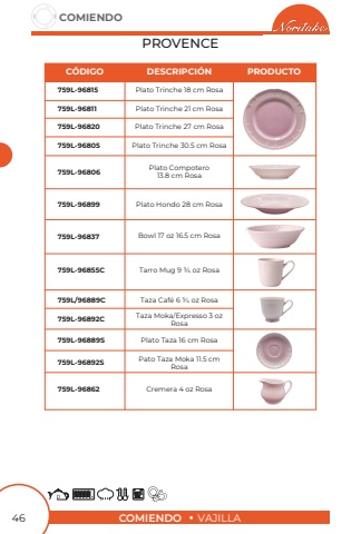 COMIENDOVAJILLACOMIENDO46PROVENCEPlato Trinche 18 cm RosaPlato Trinche 27 cm RosaPlato Trinche 30.5 cm RosaPlato Hondo 28 cm RosaPlato Compotero13.8 cm RosaBowl 17 oz 16.5 cm RosaTarro Mug 9 3/4 oz RosaCremera 4 oz RosaTaza Caf%u00e9 6 3/4 oz RosaPlato Taza 16 cm RosaTaza Moka/Expresso 3 oz RosaPato Taza Moka 11.5 cm RosaPlato Trinche 21 cm Rosa759L-96815759L-96820759L-96805759L-96899759L-96806759L-96837759L-96855C759L-96862759L/96889C759L-96889S759L-96892C759L-96892S759L-96811C%u00d3DIGODESCRIPCI%u00d3NPRODUCTO