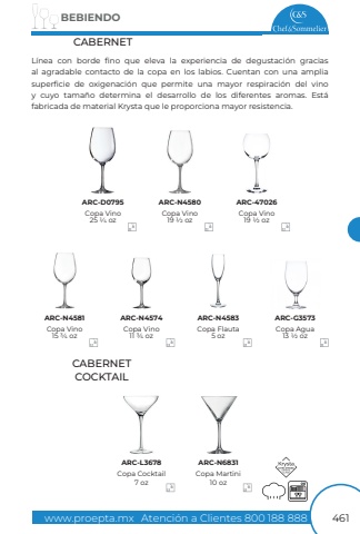 www.proepta.mxAtenci%u00f3n a Clientes 800 188 888BEBIENDO461Copa Vino25 1/4 ozCopa Vino11 3/4 oz666666666Copa Vino19 1/2 ozCopa Flauta5 ozCopa Agua13 1/2 ozCopa Vino15 3/4 ozCopa Vino19 1/2 ozCopa Martini10 ozCopa Cocktail7 ozARC-D0795ARC-N4574ARC-N4580ARC-N4581ARC-N4583ARC-G3573ARC-47026ARC-L3678ARC-N6831CABERNETCABERNETCOCKTAILL%u00ednea con borde fino que eleva la experiencia de degustaci%u00f3n gracias al agradable contacto de la copa en los labios. Cuentan con una ampliasuperficie de oxigenaci%u00f3n que permite una mayor respiraci%u00f3n del vino y cuyo tama%u00f1o determina el desarrollo de los diferentes aromas. Est%u00e1fabricada de material Krysta que le proporciona mayor resistencia.