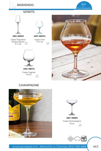 www.proepta.mxAtenci%u00f3n a Clientes 800 188 888BEBIENDO463SPIRITSCHAMPAGNECopa Licor5 3/4 ozCopa Cognac24 ozCopa Champagne10 oz666ARC-N6374ARC-N8172ARC-N6815Copa TequileraKrysta Spirits3 3/4 ozARC-N821212