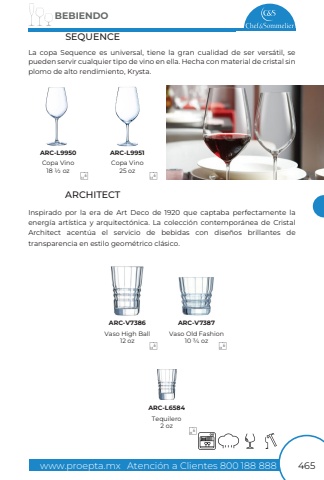 www.proepta.mxAtenci%u00f3n a Clientes 800 188 888BEBIENDO465La copa Sequence es universal, tiene la gran cualidad de ser vers%u00e1til, sepueden servir cualquier tipo de vino en ella. Hecha con material de cristal sin plomo de alto rendimiento, Krysta.SEQUENCECopa Vino18 1/2 ozCopa Vino25 ozARC-L9950ARC-L995166ARCHITECTInspirado por la era de Art Deco de 1920 que captaba perfectamente laenerg%u00eda art%u00edstica y arquitect%u00f3nica. La colecci%u00f3n contempor%u00e1nea de CristalArchitect acent%u00faa el servicio de bebidas con dise%u00f1os brillantes detransparencia en estilo geom%u00e9trico cl%u00e1sico.Vaso High Ball12 oz666Vaso Old Fashion10 3/4 ozTequilero2 ozARC-V7386ARC-V7387ARC-L6584