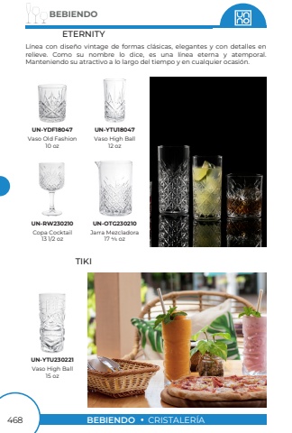 BEBIENDO468BEBIENDOCRISTALER%u00cdAETERNITYTIKIL%u00ednea con dise%u00f1o vintage de formas cl%u00e1sicas, elegantes y con detalles enrelieve. Como su nombre lo dice, es una l%u00ednea eterna y atemporal.Manteniendo su atractivo a lo largo del tiempo y en cualquier ocasi%u00f3n.Copa Cocktail13 1/2 ozVaso High Ball15 ozVaso Old Fashion 10 ozJarra Mezcladora17 4/5 ozVaso High Ball12 ozUN-RW230210UN-YTU230221UN-YDF18047UN-OTG230210UN-YTU18047