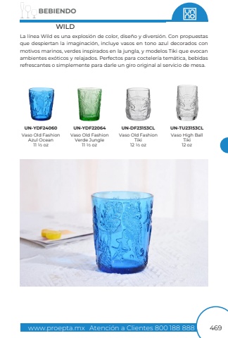 www.proepta.mxAtenci%u00f3n a Clientes 800 188 888BEBIENDO469WILDLa l%u00ednea Wild es una explosi%u00f3n de color, dise%u00f1o y diversi%u00f3n. Con propuestas que despiertan la imaginaci%u00f3n, incluye vasos en tono azul decorados con motivos marinos, verdes inspirados en la jungla, y modelos Tiki que evocan ambientes ex%u00f3ticos y relajados. Perfectos para cocteler%u00eda tem%u00e1tica, bebidas refrescantes o simplemente para darle un giro original al servicio de mesa.Vaso Old FashionAzul Ocean11 1/2 ozVaso Old FashionTiki12 1/2 ozVaso High BallTiki12 ozVaso Old FashionVerde Jungle11 1/2 ozUN-YDF24060UN-YDF22064UN-DF23153CLUN-TU23153CL