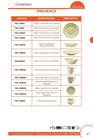 www.proepta.mxAtenci%u00f3n a Clientes 800 188 888COMIENDO47PROVENCEPlato Trinche 18 cm AmarilloPlato Trinche 27 cm AmarilloPlato Trinche 30.5 cm AmarilloPlato Hondo 28 cm AmarilloBowl 17 oz 16.5 cm AmarilloTarro Mug 9 3/4 oz AmarilloCremera 4 oz AmarilloTaza Caf%u00e9 6 3/4 oz AmarilloPlato Taza 16 cm AmarilloTaza Moka/Expresso 3 oz AmarilloPato Taza Moka 11.5 cm AmarilloPlato Compotero13.8 cm AmarilloPlato Trinche 21 cm Amarillo761L-96815761L-96820761L-96805761L-96899761L/96837761L-96855C761L-96862761L-96889C761L-96889S761L-96892C761L-96892S761L-96806761L-96811C%u00d3DIGODESCRIPCI%u00d3NPRODUCTO