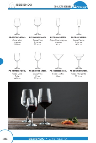 BEBIENDO486BEBIENDOCRISTALER%u00cdACopa VinoIntense15 1/5 ozCopa VinoIntense18 1/5 ozPE-JBX1001-450CLPE-JBX1001-540CLCopa ChampagneIntense6 ozCopa FlautaIntense4 3/5 ozPE-JBX1015-175CLPE-JBSW0302CLCopa VinoEclat14 1/5 ozCopa VinoEclat16 3/5 ozPE-JBX1002-420CLPE-JBX1002-490CLCopa Martini10 ozCopa Margarita10 3/5 ozPE-JBGJ5022-295CLPE-JBGJ5019-315CL