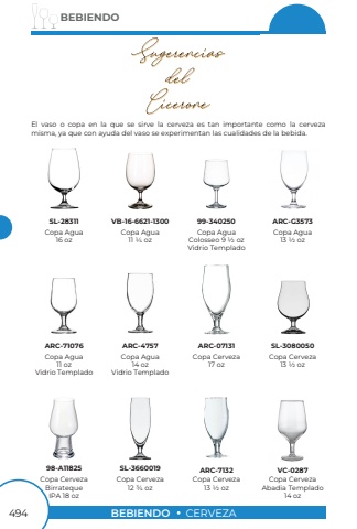 BEBIENDO494BEBIENDOCERVEZAEl vaso o copa en la que se sirve la cerveza es tan importante como la cervezamisma, ya que con ayuda del vaso se experimentan las cualidades de la bebida.Copa Agua16 ozSL-28311Copa Agua13 1/2 ozARC-G3573Copa Agua11 1/4 ozVB-16-6621-1300Copa Agua11 ozVidrio TempladoARC-71076Copa Agua14 ozVidrio TempladoARC-4757Copa AguaColosseo 9 1/2 ozVidrio Templado99-340250Copa Cerveza17 ozCopa Cerveza 13 1/2 ozARC-07131ARC-7132Copa Cerveza13 1/2 ozSL-3080050Copa Cerveza12 3/4 ozSL-3660019Copa CervezaBirratequeIPA 18 oz98-A11825Copa CervezaAbadia Templado 14 ozVC-0287