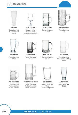 BEBIENDO496BEBIENDOCERVEZACopa PetiteCuvee 12 ozVidrio TempladoARC-71093Tarro Cerveza17 1/2 ozTarro Cerveza1 LtSL-5000052SL-5000053Tarro Cerveza17 oz99-133440Copa CervezaDoble Pared16 ozUN-055Tarro CervezaPolicarbonato Trans. 37 1/5 ozPE-JBPJ7003-1100CTarro CervezaMunich Beer Mug12 ozGL-261590Tarro Cerveza25 ozTarro Cerveza10 ozARC-C1643ARC-53404Tarro CervezaPolicarbonato Trans. 11 4/5 ozPE-JBS213CLVaso High Ball17 ozVidrio Templado99-1005133Vaso High Ball14 ozARC-79698