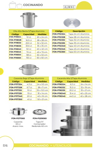 516COCINANDOUTENCILIOSCOCINANDOPJN-P112324PJN-P118324PJN-P112328PJN-P118328PJN-P112332PJN-P118332PJN-P112335PJN-P118335PJN-P118340PJN-P118345PJN-P118350PJN-P118360PJN-P112340PJN-P112345PJN-P112350Tapa 24 cm Aluminio10 LtTapa 28 cm Aluminio16.5 LtTapa 32 cm Aluminio25.5 LtTapa 35 cm Aluminio33.6 Lt50 Lt72 Lt98 Lt155 LtTapa 40 cm AluminioTapa 45 cm AluminioTapa 50 cm Aluminio20 x 24 cm28 x 28 cm32 x 32 cm35 x 35 cm40 x 40 cm45 x 72 cm50 x 50 cm60 x 60 cmC%u00f3digoC%u00f3digoOlla Alta Recta S/Tapa AluminioDescripci%u00f3nCapacidadMedidasPJN-P117324PJN-P117328PJN-P117332PJN-P117335PJN-P117340PJN-P1173504.3 Lt6.7 Lt10 Lt13 Lt20 Lt41 Lt24 x 9.5 cm28 x 11 cm32 x 12.5 cm35 x 14 cm40 x 16 cm50 x 21 cmC%u00f3digoCacerola Baja S/Tapa AluminioCapacidadMedidasCacerola65 LtAcero Inox.PJN-P217060Tapa P/ContenedorRedondo 60 cmPJN-P209060PJN-P116324PJN-P116332PJN-P116335PJN-P116340PJN-P1163456.3 Lt15.2 Lt20.2 Lt31.4 Lt44.5 Lt24 x 14 cm32 x 19 cm35 x 21 cm40 x 25 cm45 x 28 cmC%u00f3digoCacerola Alta S/Tapa AluminioCapacidadMedidas