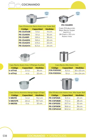 518COCINANDOUTENCILIOSCOCINANDOPJN-P203020PJN-P2030246.2 Lt10 Lt20 x 20 cm24 x 24 cmC%u00f3digoCazo Recto Alto Acero Inox.CapacidadMedidasPE-CSA1408PE-CSA1610PE-CSA1811PE-CSA2012PE-CSA2213PE-CSA24141.3 Lt1.9 Lt2.8 Lt3.8 Lt4.9 Lt6.3 Lt14 cm16 cm18 cm20 cm22 cm24 cmC%u00f3digoCazo P/Inducci%u00f3n Recto Acero Inox. Super BoilCapacidadMedidasIncluyeTapaV-47740V-477422.1 Lt4 Lt18 cm22 cmC%u00f3digoCazo Recto Acero Inox. C/Mango AuxiliarCapacidadMedidasV-682115V-6821275V-6821551.4 Lt2.6 Lt5 Lt15.2 cm19.7 cm25 cmC%u00f3digoCazo C%u00f3nico Aluminio Mango Negro S/TapaCapacidadMedidasPE-CSP2525PE-CSP2828PE-CSP3232PE-CSP3636PE-CSP404012.3 Lt17.2 Lt25.7 Lt36.6 Lt50.2 Lt25 cm28 cm32 cm36 cm40 cmC%u00f3digoOlla P/Inducci%u00f3n Acero Inox. Alta Super BoilCapacidadMedidasIncluyeTapaCazo P/Inducci%u00f3n Bajo Recto SuperNoil 6 Lt28 Diam x 9.5 cmAcero Inox.PE-CSA2810IncluyeTapa