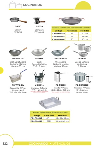 522COCINANDOUTENCILIOSCOCINANDOWok 5.2 Lt Acero Carbono MangoMadera 35 cmWokAcero Carbono35.6 x 9.9 cmMF-062035V-58814Wok AceroCarbono MangoMadera 35 cmJuego Bater%u00edade Cocina6 PiezasPE-CWW-14V-3820*Incluye 4 Insertos Perforadosde Acero Inoxidable*Compatible Con PE-CCS3624Cocedor P/Pasta17.5 Lt AluminioCanastilla P/FreirMnago Azul33.5 x 14 x 14.5 cmInserto P/Pasta32.6 x 20.5 x 26.8 cmCocedor P/PastaC/4 Insertos24.4 Lt 36 cmPE-WFB-BLV-682114PE-PB350PE-CCPB350Sart%u00e9nP/FlameL%u00e1mparaP/Flameo11-101011-1039x4PJN-P994040PJN-P994955PJN-P9940909165040 cm55 cm90 cmC%u00f3digoPaellera Valenciana Acero Pulido CarbonoPorcionesMedidasPJN-P114040PJN-P1140606.3 Lt19 Lt40 x 30 x 6.5 cm60 x 40 x 9 cmC%u00f3digoCharola P/Rostizar C/Asas Acero Inox.CapacidadMedidas