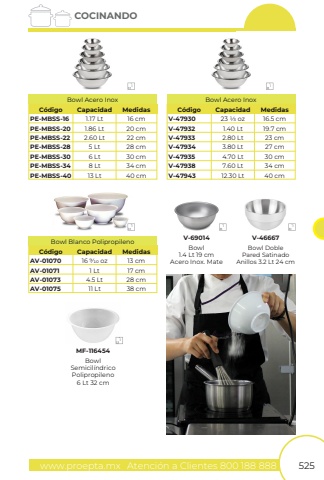 www.proepta.mxAtenci%u00f3n a Clientes 800 188 888525COCINANDOAV-01070PE-MBSS-16V-47930AV-01071PE-MBSS-20V-47932AV-01073AV-01075PE-MBSS-22V-47933PE-MBSS-28V-47934PE-MBSS-30V-47935PE-MBSS-34V-47938PE-MBSS-40V-4794316 9/10 oz1.17 Lt23 1/3 oz1 Lt1.86 Lt1.40 Lt4.5 Lt11 Lt2.60 Lt2.80 Lt5 Lt3.80 Lt6 Lt4.70 Lt8 Lt7.60 Lt13 Lt12.30 Lt13 cm16 cm16.5 cm17 cm20 cm19.7 cm28 cm38 cm22 cm23 cm28 cm27 cm30 cm30 cm34 cm34 cm40 cm40 cmC%u00f3digoC%u00f3digoC%u00f3digoBowl Blanco PolipropilenoBowl Acero InoxBowl Acero InoxCapacidadCapacidadCapacidadMedidasMedidasMedidasBowl1.4 Lt 19 cmAcero Inox. MateBowlSemicil%u00edndricoPolipropileno6 Lt 32 cmBowl DoblePared SatinadoAnillos 3.2 Lt 24 cmV-69014MF-116454V-46667 1 1 1 1 1 1