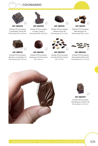 www.proepta.mxAtenci%u00f3n a Clientes 800 188 888529COCINANDOMolde P/ChocolatesCuadrados Flores 36Porciones 2.5 x 2.5 cmMolde P/ChocolatesBonbon Cuadrado 24Porciones 2.6 x 1.6 cmMolde P/ChocolatesConejo Cesta 2Porciones 18 x 15.5 cmMolde P/ChocolatesRosacea 24 Porciones 2.9 x 1.9 cmMolde P/ChocolatesSurtido 35 Porciones 27 x 17 cmMolde P/ChocolatesPescasdos Mixtos 30 Porciones 3 x 2 x 2 cmMolde P/ChocolatesRect%u00e1ngulo Tulipan 36 Porciones 3 x 2.2 cmMolde P/ChocolatesMedia Nuez 50Porciones 3.1 x 2 cmMolde P/ChocolatesRect%u00e1ngulo 24Porciones 3.6 x 2 cmMF-380106MF-380112MF-382015MF-380152MF-380201MF-380202MF-380107MF-380110MF-380111 1 1 1 1 1 1 1 1 1