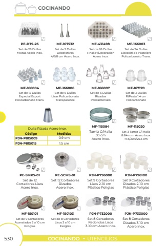 530COCINANDOUTENCILIOSCOCINANDOSet de 26 DullasMixtas Acero Inox.Set de 2 DullasDecorativas4/6/8 cm Acero Inox.Set 3 Tamiz C/ Malla 8.84 mm Acero Inox. 17.5/20.5/25.5 cmSet de 9 CortadoresAcanalados 2 a 10 cmExoglasSet de 8 CortadoresLisos 3 a 10 cmExoglasSet 9 Cortadores Lisos 2-10 cmPl%u00e1stico PoliglasSet 9 Cortadores Rizados 2-10 cmPl%u00e1stico PoliglasSet 8 Cortadores Redondos Lisos3-10 cm Acero Inox.Set 8 Cortadores Rizados 3-10 cm Acero Inox.Tamiz C/Malla30 cmAcero Inox.Set de 26 DullasFinas P/Decoraci%u00f3nAcero Inox.Set de 24 DullasElecci%u00f3n de PasteleroPolicarbonato Trans.Set de 6 DullasRizadasPolicarbonatoSet de 2 DullasP/Pasta 1.4 cmPolicarbonatoSet de 12 DullasEspecial ExportPolicarbonato Trans.Set de 6 DullasLisas Policarbonato TransparentePE-DTS-26MF-167532MF-115020MF-150101MF-150103PJN-P796000PJN-P796100PJN-P732000PJN-P733000MF-115084MF-431498MF-166003MF-166004MF-166006MF-166007MF-167170 1 1 1 1 1 1 1 1 1 1 1 1 1 1 1PJN-P815009PJN-P8150150.9 cm1.5 cmC%u00f3digoDulla Rizada Acero Inox.MedidasSet de 12Cortadores LisosAcero Inox.Set 12 CortadoresRizadosAcero Inox.PE-SMRS-01PE-SCMS-01 1 1