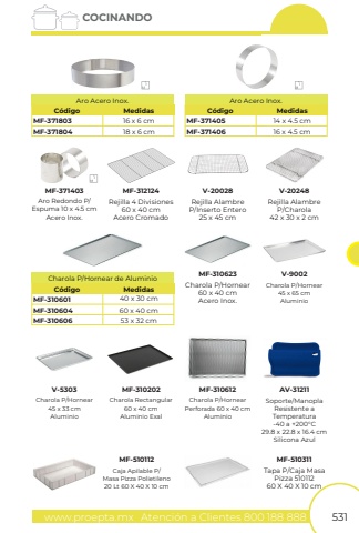 www.proepta.mxAtenci%u00f3n a Clientes 800 188 888531COCINANDOAro Redondo P/Espuma 10 x 4.5 cmAcero Inox.MF-371403 1 1 1MF-371803MF-371405MF-371804MF-37140616 x 6 cm14 x 4.5 cm18 x 6 cm16 x 4.5 cmC%u00f3digoC%u00f3digoAro Acero Inox.Aro Acero Inox.MedidasMedidasRejilla 4 Divisiones60 x 40 cmAcero CromadoCharola P/Hornear60 x 40 cmAcero Inox.MF-312124MF-310623MF-310601MF-310604MF-31060640 x 30 cm60 x 40 cm53 x 32 cmC%u00f3digoCharola P/Hornear de AluminioMedidasCharola Rectangular60 x 40 cmAluminio ExalCharola P/HornearPerforada 60 x 40 cm AluminioCharola P/Hornear45 x 65 cmAluminioCharola P/Hornear45 x 33 cmAluminioMF-310202MF-310612V-9002V-5303Rejilla AlambreP/Charola42 x 30 x 2 cmV-20248Rejilla AlambreP/Inserto Entero25 x 45 cmV-20028Caja Apilable P/Masa Pizza Polietileno 20 Lt 60 X 40 X 10 cmMF-510112Tapa P/Caja Masa Pizza 51011260 X 40 X 10 cmMF-510311Soporte/ManoplaResistente a Temperatura-40 a +200%u00b0C29.8 x 22.8 x 16.4 cmSilicona AzulAV-31211