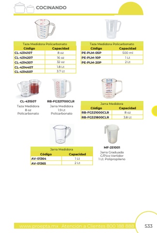 www.proepta.mxAtenci%u00f3n a Clientes 800 188 888533COCINANDOTaza Medidora8 ozPolicarbonatoJarra Medidora1.9 LtPolicarbonatoCL-431507RB-FG321700CLRCL-4314107PE-PLM-05PCL-4314207PE-PLM-10PCL-4314307PE-PLM-20PCL-4314407CL-43145078 oz500 ml16 oz1 Lt32 oz2 Lt1.8 Lt3.7 LtC%u00f3digoC%u00f3digoTaza Medidora PolicarbonatoTaza Medidora PolicarbonatoCapacidadCapacidadRB-FG321000CLRRB-FG321800CLR8 oz3.8 LtC%u00f3digoJarra MedidoraCapacidadJarra GraduadaC/Pico Vertidor1 Lt. PolipropilenoMF-251001AV-01364AV-013651 Lt2 LtC%u00f3digoJarra MedidoraCapacidad