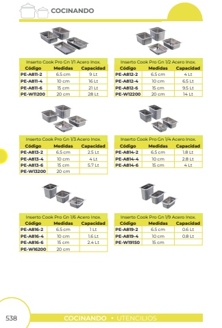 538COCINANDOUTENCILIOSCOCINANDOPE-A811-2PE-A813-2PE-A816-2PE-A819-2PE-A814-2PE-A812-2PE-A811-4PE-A813-4PE-A816-4PE-A819-4PE-A814-4PE-A812-4PE-A811-6PE-A813-6PE-A816-6PE-W19150PE-A814-6PE-A812-6PE-W11200PE-W13200PE-W16200PE-W122006.5 cm6.5 cm6.5 cm6.5 cm6.5 cm6.5 cm10 cm10 cm10 cm10 cm10 cm10 cm15 cm15 cm15 cm15 cm15 cm15 cm20 cm20 cm20 cm20 cm9 Lt2.5 Lt1 Lt0.6 Lt1.8 Lt4 Lt16 Lt4 Lt1.6 Lt0.8 Lt2.8 Lt6.5 Lt21 Lt5.7 Lt2.4 Lt4 Lt9.5 Lt28 Lt14 LtC%u00f3digoC%u00f3digoC%u00f3digoC%u00f3digoC%u00f3digoC%u00f3digoInserto Cook Pro Gn 1/1 Acero Inox.Inserto Cook Pro Gn 1/3 Acero Inox.Inserto Cook Pro Gn 1/6 Acero Inox.Inserto Cook Pro Gn 1/9 Acero Inox.Inserto Cook Pro Gn 1/4 Acero Inox.Inserto Cook Pro Gn 1/2 Acero Inox.MedidasMedidasMedidasMedidasMedidasCapacidadMedidasCapacidadCapacidadCapacidadCapacidadCapacidad