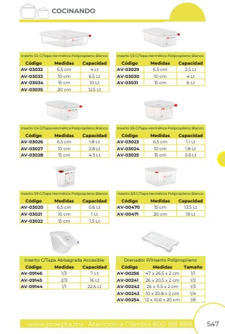 www.proepta.mxAtenci%u00f3n a Clientes 800 188 888547COCINANDOAV-09146AV-09145AV-091441/32/31/17 Lt16 Lt22.6 LtC%u00f3digoInserto C/Tapa Abisagrada AccesibleMedidasCapacidadAV-03032AV-00256AV-03029AV-03026AV-03020AV-00470AV-03023AV-03033AV-00241AV-03030AV-03027AV-03021AV-00471AV-03024AV-03034AV-00242AV-03031AV-03028AV-03022AV-03025AV-03035AV-00243AV-002546.5 cm47 x 26.5 x 2 cm1/16.5 cm6.5 cm6.5 cm15 cm6.5 cm10 cm26 x 20.5 x 2 cm1/210 cm10 cm10 cm20 cm10 cm15 cm26 x 11.5 x 2 cm1/315 cm15 cm15 cm15 cm20 cm10 x 20.8 x 2 cm12 x 10.6 x 20 cm1/41/64 Lt2.5 Lt1.8 Lt0.6 Lt13.5 Lt1.1 Lt6.5 Lt4 Lt2.8 Lt1 Lt19 Lt1.8 Lt10 Lt6 Lt4.3 Lt1.5 Lt2.6 Lt12.5 LtC%u00f3digoC%u00f3digoC%u00f3digoC%u00f3digoC%u00f3digoC%u00f3digoC%u00f3digoInserto 1/2 C/Tapa Herm%u00e9tica Polipropileno BlancoDrenador P/Inserto PolipropilenoInserto 1/3 C/Tapa Herm%u00e9tica Polipropileno BlancoInserto 1/4 C/Tapa Herm%u00e9tica Polipropileno BlancoInserto 1/9 C/Tapa Herm%u00e9tica Polipropileno BlancoInserto 2/3 C/Tapa Herm%u00e9tica Polipropileno BlancoInserto 1/6 C/Tapa Herm%u00e9tica Polipropileno BlancoMedidasMedidasTama%u00f1oMedidasMedidasMedidasMedidasMedidasCapacidadCapacidadCapacidadCapacidadCapacidadCapacidad