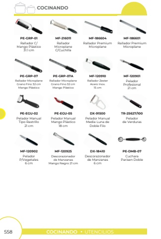 558COCINANDOUTENCILIOSCOCINANDOPelador ManualTipo Rastrillo21 cmPelador ManualMango Pl%u00e1stico18 cmPelador ManualMedia Luna deDoble FiloPelador de VerdurasPelador P/Vegetales6 cmDescorazonadorde ManzanasMango Negro 21 cmDescorazonadorde Manzanas6 cmCucharaParisen DoblePE-EGU-02PE-EGU-05DX-91500TR-25627/100MF-120902MF-120925DX-18410PE-DMB-07Rallador C/Mango Pl%u00e1stico31.1 cmPE-GRP-01RalladorMicroplaneC/CuchillaRallador PremiumMicroplaneRallador PremiumMicroplaneMF-216011MF-186604MF-186601Rallador Microplane Grano Fino 32 cm Mango Pl%u00e1sticoRallador Microplane Grano Fino 32 cm Mango Pl%u00e1sticoPE-GRP-07PE-GRP-07ARallador ZesterAcero Inox.15 cmMF-120910PeladorProfesional21 cmMF-120901