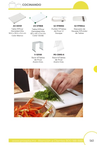 www.proepta.mxAtenci%u00f3n a Clientes 800 188 888561COCINANDOTabla P/PicarDensidad Alta60 x 40 x 2.4 cmColor VerdeRack P/Tablasde PicarAcero Inox.Rack P/Tablasde PicarAcero Inox.Tabla P/PicarDensidad Alta50.4 x 30.4 x 3.4 cmColor BlancoPulidor P/Tablasde Picar C/NavajasRepuesto deNavajas P/Pulidorde TablasAV-07858V-52100PE-CBRS-6AV-00101SJ-1178902SJ-1179944