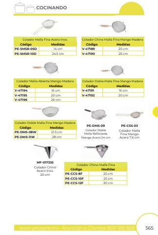 www.proepta.mxAtenci%u00f3n a Clientes 800 188 888565COCINANDOPE-SMSR-05DPE-SMSR-10D14 cm24.5 cmC%u00f3digoColador Malla Fina Acero Inox.MedidasV-47189V-4719020 cm25 cmC%u00f3digoColador Chino Malla Fina Mango MaderaMedidasV-47194V-47195V-4719616 cm20 cm26 cmC%u00f3digoColador Malla Abierta Mango MaderaMedidasV-47191PE-DMS-08WV-47192PE-DMS-11W16 cm21.5 cm20 cm28 cmC%u00f3digoC%u00f3digoColador Doble Malla Fina Mango MaderaColador Doble Malla Fina Mango MaderaMedidasMedidasColador MallaFina MangoAcero 7.6 cmPE-CSS-03Colador DobleMalla ReforzadaMango Acero 24 cmColador ChinoAcero Inox.20 cmPE-DMS-09MF-017335PE-CCS-8FPE-CCS-10FPE-CCS-12F20 cm25 cm30 cmC%u00f3digoColador Chino Malla FinaMedidas