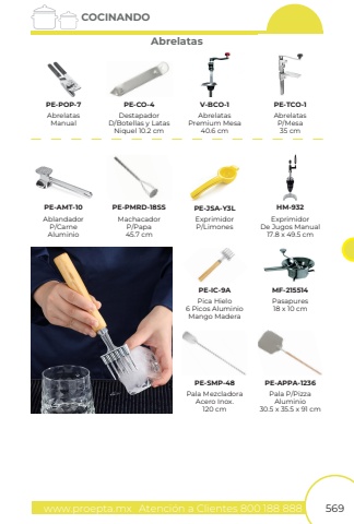 www.proepta.mxAtenci%u00f3n a Clientes 800 188 888569COCINANDOAbrelatasAbrelatasManualAbrelatasPremium Mesa40.6 cmAbrelatasP/Mesa35 cmPE-POP-7V-BCO-1PE-TCO-1AblandadorP/CarneAluminioMachacadorP/Papa45.7 cmPE-AMT-10PE-PMRD-18SSDestapadorD/Botellas y LatasNiquel 10.2 cmExprimidorP/LimonesPE-CO-4PE-JSA-Y3LExprimidorDe Jugos Manual17.8 x 49.5 cmHM-932Pica Hielo6 Picos AluminioMango MaderaPala MezcladoraAcero Inox.120 cmPala P/PizzaAluminio30.5 x 35.5 x 91 cmPasapures18 x 10 cmPE-IC-9APE-SMP-48PE-APPA-1236MF-215514