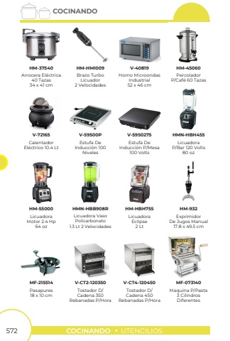 572COCINANDOUTENCILIOSCOCINANDOArrocera El%u00e9ctrica40 Tazas34 x 41 cmHorno MicroondasIndustrial52 x 46 cmEstufa DeInducci%u00f3n P/Mesa100 VoltsLicuadoraEclipse2 LtExprimidorDe Jugos Manual17.8 x 49.5 cmPercoladorP/Caf%u00e9 60 TazasLicuadoraP/Bar 120 Volts80 ozCalentadorEl%u00e9ctrico 10.4 LtLicuadoraMotor 2.4 Hp64 ozPasapures18 x 10 cmBrazo TurboLicuador2 VelocidadesEstufa DeInducci%u00f3n 100NivelesLicuadora VasoPolicarbonato1.3 Lt 2 VelocidadesHM-37540V-40819V-5950275HM-HBH755HM-932HM-45060V-72165HMN-HBH455HM-55000MF-215514HM-HMI009V-59500PHMN-HBB908RTostador D/Cadena 350Rebanadas P/HoraV-CT2-120350Tostador D/Cadena 450Rebanadas P/HoraV-CT4-120450Maquina P/Pasta3 CilindrosDiferentesMF-073140